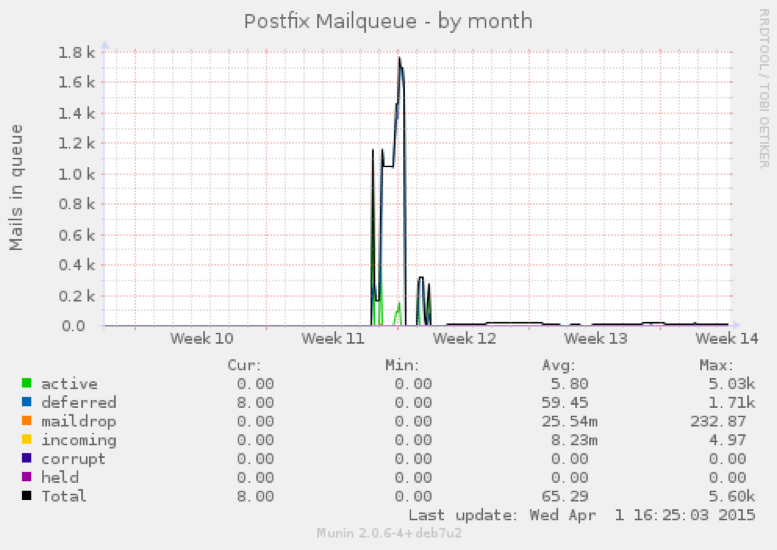 Revisamos gráficas de colas de correo y logs de acceso web y mail, para detectar infecciones que provocan envíos masivos de spam ilícitamente en nombre del dominio del cliente y sin su conocimiento: