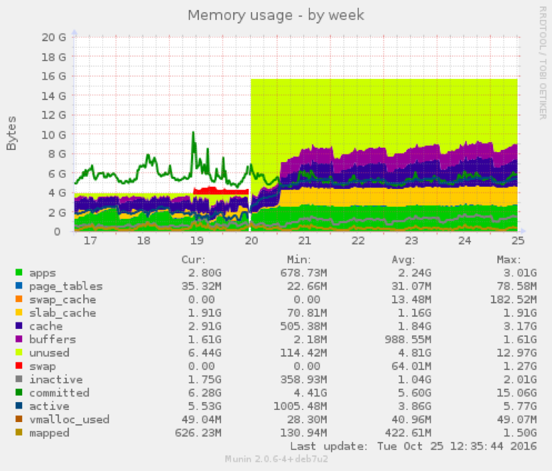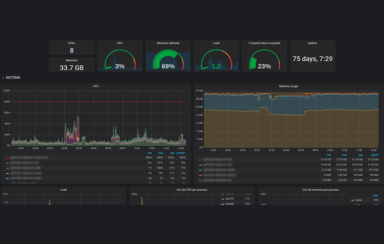 De forma constante, desde nuestros servidores de monitorización capturamos datos para realizar hasta 27 gráficas de control, no sólo de RAM o CPU, sino también de Threads Apache/Nginx, SlowQueries, Load y un largo etc, que revisaremos de forma diaria en nuestros mantenimientos a primera hora del día y que el cliente podrá consultar en su panel a modo informativo.