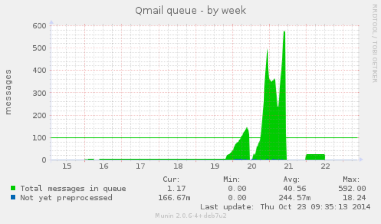 Revisamos gráficas de colas de correo y logs de acceso web y mail, para detectar infecciones que provocan envíos masivos de spam ilícitamente en nombre del dominio del cliente y sin su conocimiento: